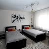 Schlafzimmer: Boden mit Teppich, Wände Tapete, Decke weiß gestrichen.