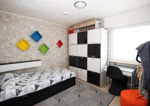 Kinderzimmer: Boden mit Teppich, Deckenplatten weiß, Wände mit Tapete, Zugang zum Balkon -