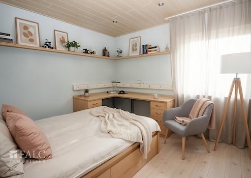 Schlafzimmer: Holzboden helle Eiche Optik, Einbaudownlights.