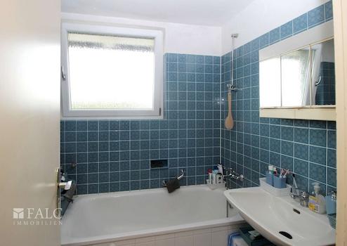 Bad: Raum bis ca. 30 cm unter der Decke gefliest, 1 Waschbecken, Badewanne mit integrierter Dusche, Fenster Kunststoff weiß.