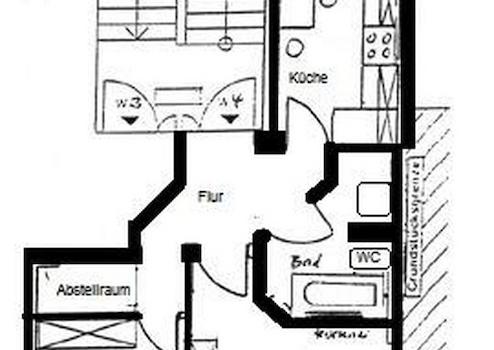 Zur Wohnung gehört neben Wohnzimmer und Schlafzimmer weiterhin ein kleiner Abstellraum sowie ein Kellerraum.
