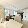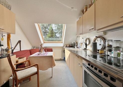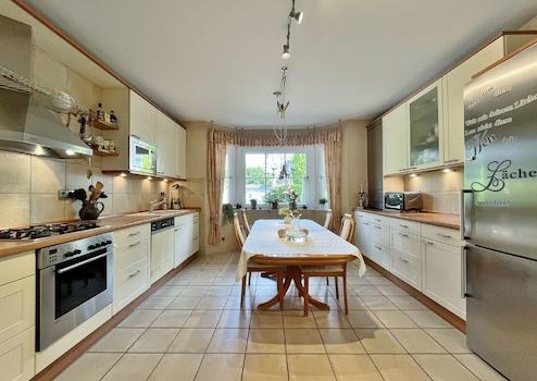 Die ca. 18 m² große Küche ist modern ausgestattet und lässt durch ihre Großzügigkeit viel Raum für gemeinsame kulinarische Erlebnisse. Ein großer Esstisch kann mittig platziert werden und bietet ausreichend Platz für gemeinsame Mahlzeiten.