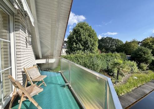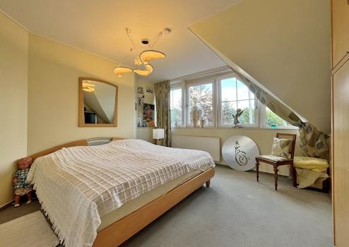 Das Hauptschlafzimmer ist mit einem Panikschalter ausgestattet und ermöglicht den Zugang auf den Balkon in Südausrichtung. Er bietet einen herrlichen Blick in den Garten und lädt zum Entspannen ein.