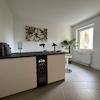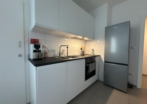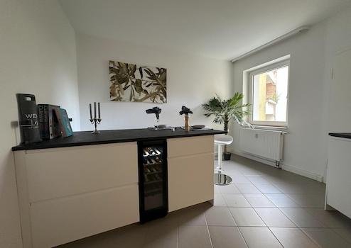 Die Wohnung wurde soeben vollständig modernisiert und geschmackvoll eingerichtet, sodass es sich um einen Erstbezug nach Sanierung handelt. Herzstück ist die großzügige, moderne Einbauküche in elegantem Weiß, ausgestattet mit einer Kücheninsel/Theke und einem separaten Weinkühlschrank.