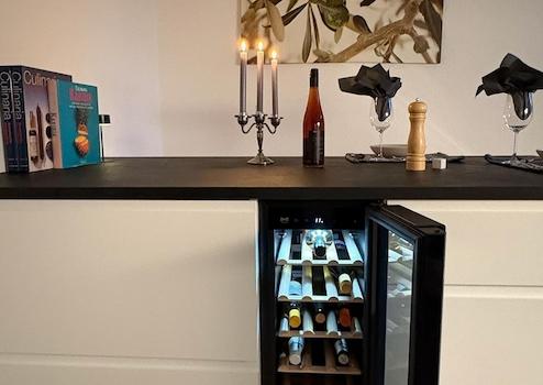 - Moderne weiße Einbauküche mit Kücheninsel/Theke und separatem Weinkühlschrank