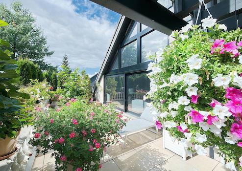 Der weitläufige Wohn- und Essbereich mit angrenzender Küche überzeugt durch direkten Zugang zu einem Balkon sowie zur rund 51 m² großen Dachterrasse in Südwestausrichtung. Ein überdachter Freisitz sorgt für geschützte Momente im Freien, der sich im Winter durch einsetzbare Elemente vollständig schließen und als Wintergarten nutzen lässt. Ein Gäste-WC komplettiert diese Etage.
