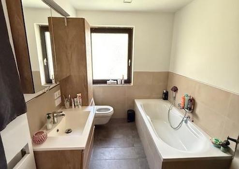 Bevor es über das verschließbare Treppenhaus nach oben geht, finden Sie links das neu gestaltete Bad mit Wanne und Dusche bevor es in das Schlafzimmer geht. Rechts von der Treppe befindet sich ein Kinderzimmer oder auch nutzbar als Büro o. Gästezimmer.