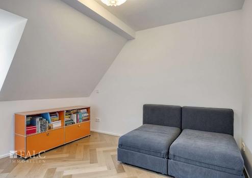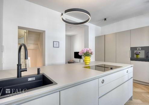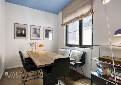 Die Ausstattung ist kompromisslos hochwertig: In allen Wohnräumen wurde edles Fischgrätenparkett aus geräucherter Eiche verlegt, das Wärme und Raffinesse ausstrahlt. Die Fußbodenheizung mit Fernwärmeanschluss sorgt für modernen Wohnkomfort. In der Küche treffen Design und Funktionalität auf höchstem Niveau zusammen – mit einer maßgefertigten Einbauküche von Leicht, ausgestattet mit modernsten Geräten von Gaggenau (Ofen und Herd) und Miele (Spülmaschine und Kühlschrank).