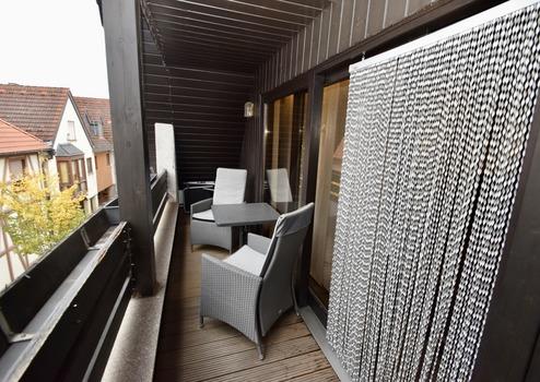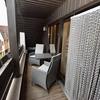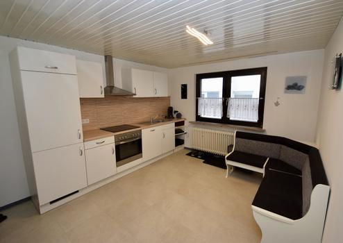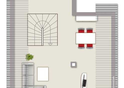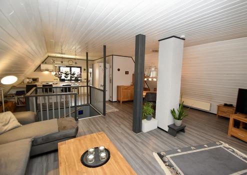 Der Wohnbereich mit offener Küche, Essecke und Wohnzimmer mit Süd-Balkon befinden sich auf einer Ebene im Dachgeschoss.