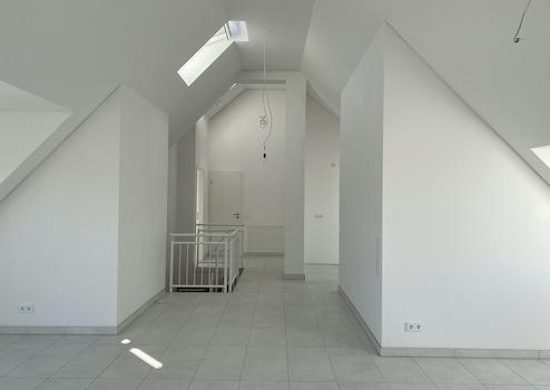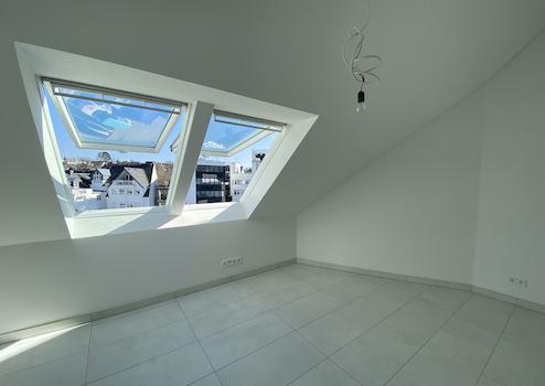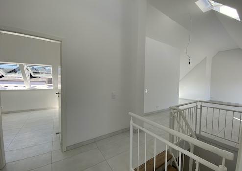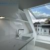 Die großzügige Deckenhöhe im 4. Obergeschoss sowie die elektrische Velux Dachflächenfenster unterstreichen dieses moderne Raumkonzept. Die Velux Dachflächenfenster im Küchenbereich lassen sich doppelt öffnen, somit entsteht ein kleiner begehbarer Dachbalkon. Auf dieser Ebene befindet sich außerdem ein Schlafzimmer, ein Arbeitszimmer und ein weiteres innenliegendes Bad mit Waschtisch, großformatigen Spiegel, bodenebener Dusche und WC.