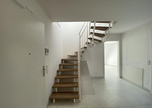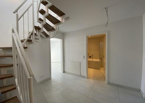Über das Treppenhaus oder mit dem Fahrstuhl gelangen Sie barrierefrei in Ihr neues Wohndomizil. Von der großzügig geschnittenen Diele aus erreichen Sie die zwei der insgesamt vier Schlafzimmer, sowie das moderne innenliegende Bad mit Badewanne und bodenebener Dusche. Die offene Gestaltung der ersten Wohnebene verleiht der Wohnung eine besondere Raumatmosphäre. Eine freitragende Treppe verbindet die beiden Wohnebenen.