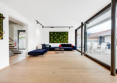 Die größtenteils raumhohen Fenster in Holz-Alu Konstruktion sind dreifach verglast und mit einem automatischen Lamellen Sonnenschutz versehen.