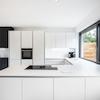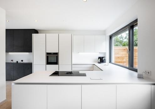 * puristische Einbauküche Lack weiß, Arbeitsplatte Keramik weiß mit hochwertigen Elektrogeräten