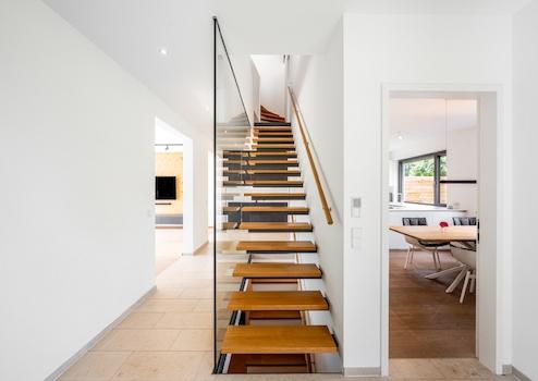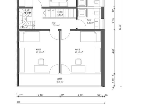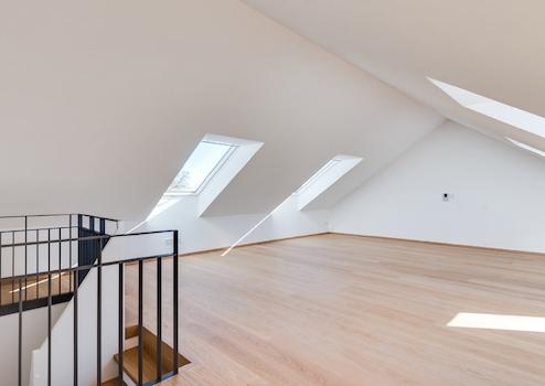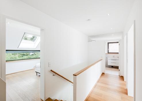 Über eine freie Treppe erschließt sich das lichtdurchflutete Dachgeschoss. Je nach Bedarf ist dieser Raum sowohl multifunktional nutzbar als auch teilbar in zwei Räume.