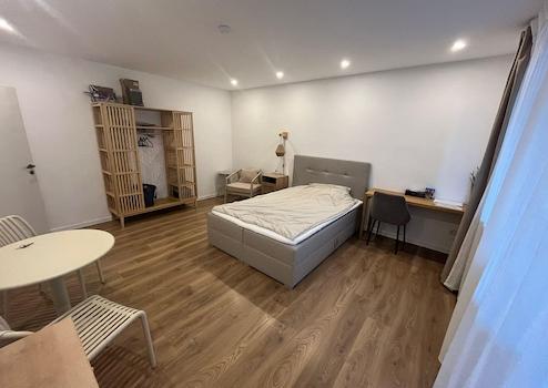Zum Zeitpunkt der Bilderaufnahme wurde die Wohnung an zwei Personen vermietet. Aktuell wird die Wohnung an eine Person vermietet, die Möblierung wurde Anfang des Jahres angepasst. Das Wohnzimmer ist klassisch eingerichtet mit Schlafsofa, Esstisch und vier Stühlen, Fernseher, Kommode sowie einem Arbeitstisch mit Stuhl.