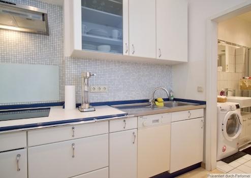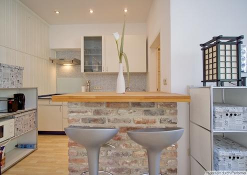 Die kleine aber feine offene Einbauküche mit Spülmaschine, Ceranherd und Microwelle ist mit Koch- und Essgeschirr ausgestattet, es gibt eine Kühl-Gefrier-Kombination. Komplettes Inventar inklusive Bettwäsche und Handtücher. Ein PKW-Stellplatz kann angemietet werden.