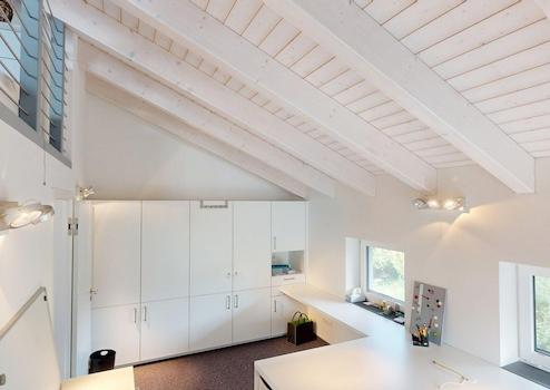 Für ein angenehmes Raumklima wurde ein Lehmputz an ausgewählten Wandflächen verarbeitet. Er ist feuchtigkeitsregulierend, unterstützt die Wärmespeicherung und bindet Schadstoffe und Gerüche. Im Haus befinden sich ein Vollbad, drei Duschbäder und ein Gäste-WC. Das Duschbad im Erdgeschoss ist barrierefrei und behindertengerecht.