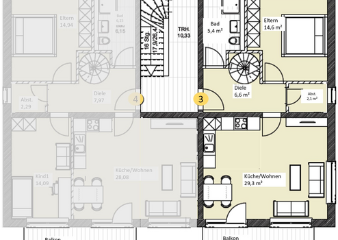 Balkon, Keller, Duschbad, Einbauküche, Fliesen