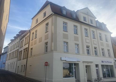 Das im Jahr 1820 errichtete Mehrfamilienhaus bietet 10 Wohneinheiten sowie 2 Gewerbeeinheiten. Das Gebäude ist gut erhalten und kombiniert klassischen Altbaucharme mit zeitgemäßer Nutzung. Für die Mieter stehen außerdem Kellerräume zur Verfügung. Die hier angebotene Wohnung hat zudem einen traumhaften Blick auf den Markt und über die Dächer der Stadt.