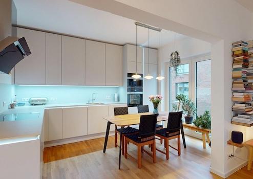 Der offene Wohn- und Essbereich bildet das Herzstück dieser besonderen Wohnung. Hier fügt sich eine exklusive SieMatic-Küche harmonisch ins Raumkonzept ein. Sie verfügt über eine besonders elegante, filigrane Keramikarbeitsplatte, die der Küche eine schwebende Leichtigkeit verleiht und gleichzeitig außerordentlich robust und pflegeleicht ist. Die Küche wird mitverkauft und ist im Kaufpreis bereits berücksichtigt. Das flächenbündig eingearbeitete Miele-Induktionskochfeld verbleibt ebenfalls in der Wohnung; alle weiteren Geräte können Sie nach eigenem Geschmack ergänzen.