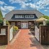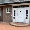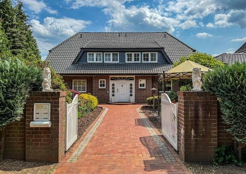 Bereits von außen vermittelt die verklinkerte Fassade im klassischen Rot, eingebettet in ein rund 894 m² großes Grundstück mit gepflegter Bepflanzung, ein einladendes Bild. Das elegante Eingangstor und die gesäumten Beete verstärken den repräsentativen Charakter.