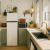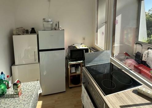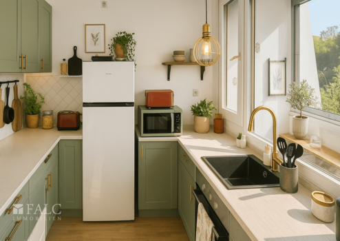 Die kompakte, separat gehaltene Küche schließt direkt an den Wohnbereich an. Sie ist funktional gestaltet und durch die leichte Offenheit zum Wohnzimmer bleibt der Austausch zwischen beiden Räumen angenehm möglich – ideal für alltagstaugliches Kochen.