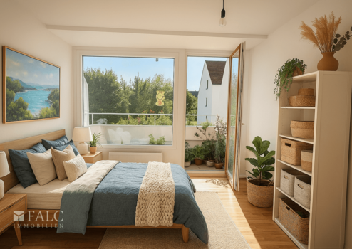 Im Schlafzimmer, das zur ruhigen Seite des Hauses ausgerichtet ist, befindet sich der Zugang zum Balkon. Hier können Sie entspannt frische Luft genießen oder den Abend ausklingen lassen. Große Fenster sorgen auch in diesem Raum für eine freundliche, helle Atmosphäre.