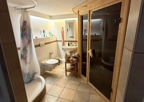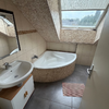 Das Obergeschoss bietet ein großes Vollbad mit eleganter Acrylwanne und separater Dusche, das durch seine Helligkeit und hochwertige Ausstattung überzeugt.