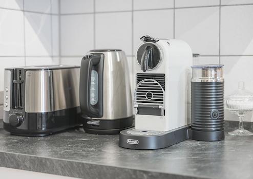 - Moderne Einbauküche mit Induktionskochfeld, Backofen, Dunstabzug, Spülmaschine, Kühl-Gefrier-Kombi, Nespresso-Maschine, SodaStream sowie komplettem Koch- und Essgeschirr