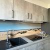 Statt des üblichen Fliesenspiegels wurde hier eine Aluverbundplatte mit Fotomotiv angebracht, die sofort Urlaubsfeeling aufkommen lässt.