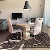 Der große Raum gliedert sich in zwei Bereiche. Direkt an der großen Fensterfront wurde der Essbereich eingerichtet und ein runder Esstisch mit vier sehr bequemen Freischwinger-Stühlen aufgestellt.