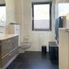 Wenn man die Diele betritt, so führt die erste Tür auf der linken Seite direkt in ein noch sehr neu wirkendes und äußerst geschmackvoll gestaltetes Badezimmer mit großem Außenfenster, das nach Norden führt.