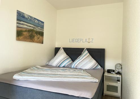 Ein dreitüriger Kleiderschrank bietet ausreichend Platz für einen Urlaubsaufenthalt. Das erst im April 2025 angeschaffte Boxspringbett sorgt für angenehmen Schlafkomfort. Diese Möblierung lässt den kleinen Raum sowohl schick und modern als auch gemütlich und warm zugleich wirken.