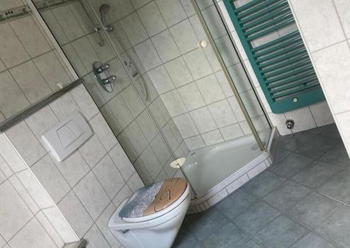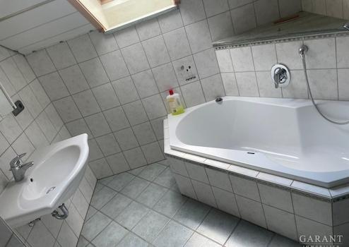 * Badezimmer mit Badewanne, Dusche und Fenster