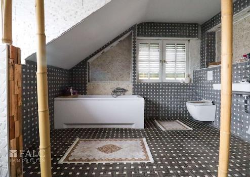 Badezimmer OG: Badewanne, WC und Waschtisch, Fliesen. 2020 erneuert