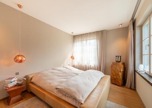 Deckenleuchten von Occhio setzen jede Fläche kunstvoll in Szene und unterstreichen die architektonischen Linien der hohen Decken. Der hochwertige Eichenparkettboden bildet die warme, natürliche Basis für das minimalistische Interior. Über eingebaute Gardinenschienen lassen sich Vorhänge wie schwebende Raumakzente integrieren, während der punktuelle Insektenschutz dezent und fast unsichtbar bleibt.