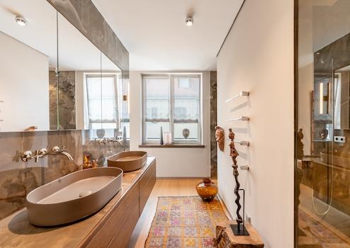 Das Bad en Suite ist ein Statement moderner Badarchitektur: Edle Materialien, Dornbracht-Armaturen in minimalistischer Formensprache und meisterhafte Schreinerarbeiten schaffen einen Rückzugsort, der Wellness und Design auf höchstem Niveau verbindet.
