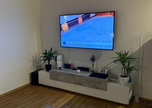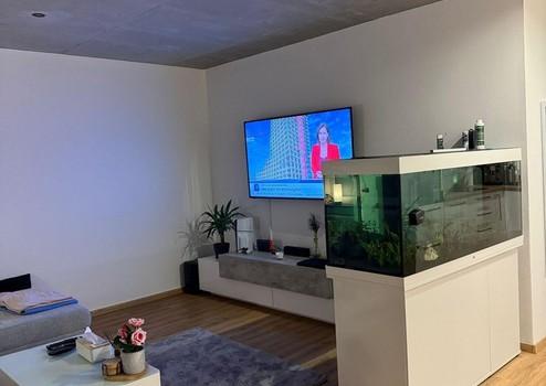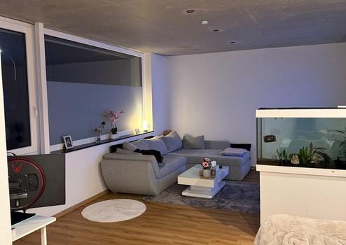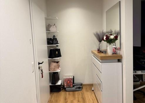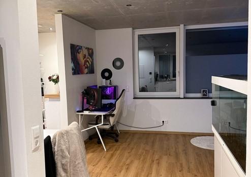 Diese modern ausgestattete Wohnung besticht durch ihre stilvolle Gestaltung und hochwertige Materialien. Der elegante Vinylboden in Eicheoptik verleiht den Räumen eine warme Atmosphäre. Das Badezimmer überzeugt mit grauen Bodenfliesen und ist mit einer Dusche, WC sowie einem praktischen Waschmaschinenanschluss ausgestattet.