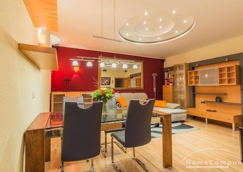 Der großzügige Wohnbereich lädt mit einer gemütlichen Couch, einer separaten Essecke und einem TV zum Entspannen und Verweilen ein - ideal für gemütliche Abende oder Homeoffice-Tage.