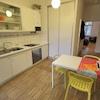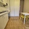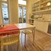In der offenen, voll ausgestatteten Küche befinden sich neben einem Herd mit separatem Backofen auch eine neue Waschmaschinen-Trockner-Kombimaschine und ein Esstisch.