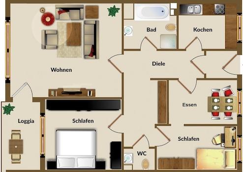 Der Grundriss ist durchdacht und zweckmäßig, drei oder vier Zimmer verteilen sich auf ca. 84 m² Wohnfläche. Mittelpunkt der Wohnung ist der helle Wohnbereich mit Austritt auf die sonnige Südloggia.