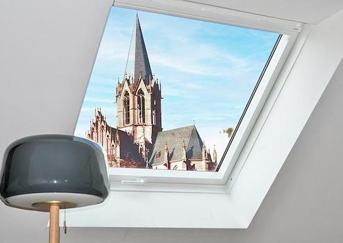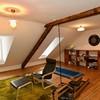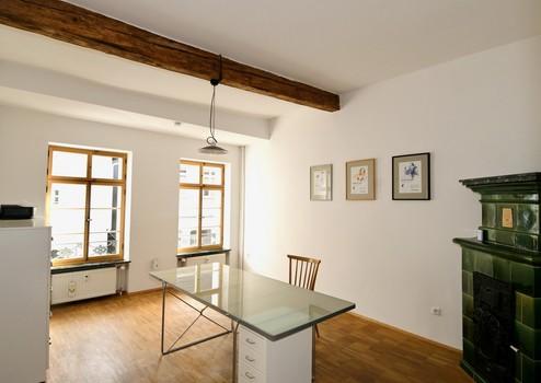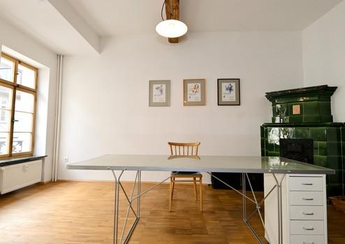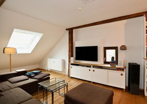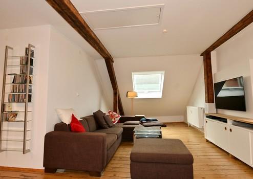 Im Dachgeschoss finden Sie einen großen Studioraum mit freigelegtem Holzgebälk, durch das Dachfenster hat man einen wunderschönen Blick auf die Katharinenkirche.