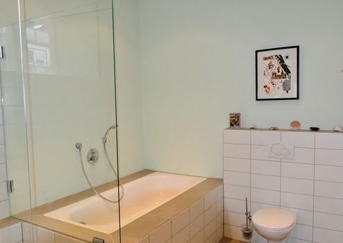 Im 2. OG befindet sich das großzügige und moderne Badezimmer, das umfangreich saniert wurde. Zur Ausstattung gehören eine bodengleiche Dusche, Badewanne, 2 Waschtische, 1 Toilette sowie Anschlüsse für Waschmaschine und Trockner. Die absolute Besonderheit ist ein aus dem 13. Jahrhundert stammendes Spitzbogenfenster.