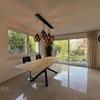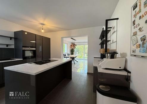 Die angrenzende Küche ist modern und funktional ausgestattet – mit hochwertigen Elektrogeräten, viel Stauraum und einer klaren Linienführung, die Kochen zum Vergnügen macht. Direkt daneben liegt das offen gestaltete Esszimmer, das ideal für gesellige Abende oder gemeinsame Mahlzeiten geeignet ist.