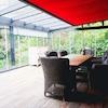 Ein großer Wintergarten ergänzt die Wohnfläche zum Garten hin. Hier ist eine Dachmarkise verbaut, die auch bei Sonneneinstrahlung Schutz bietet.