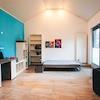 Vom Wohnbereich aus betreten Sie ein Schlafzimmer mit eigenem Bad inklusive WC und Sie haben Zugang zu einer geschützten Terrasse seitlich des Hauses.