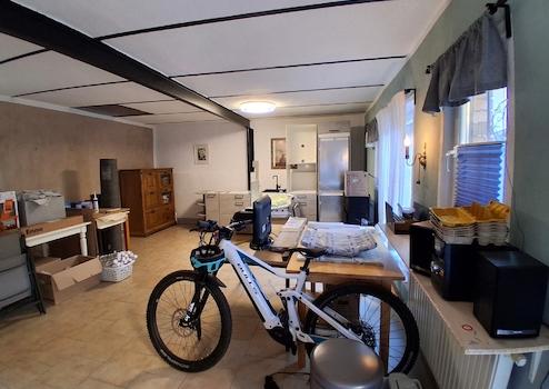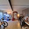 Die kleine Garage besitzt ein Tor mit Elektro-Antrieb.