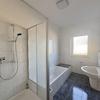 Das moderne Badezimmer ist mit dunklen Boden- und hellen Wandfliesen gestaltet. Mit Badewanne, Dusche und einem Fenster zur optimalen Belüftung bietet es hohen Komfort.