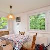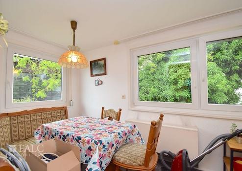 Die Küche ist funktional gestaltet und bietet genügend Raum für gemeinsame Kochabende. Angrenzend befindet sich das Esszimmer, das durch seine Größe und Helligkeit besticht und Platz für einen Esstisch und eine Eckbank bietet.