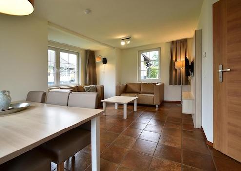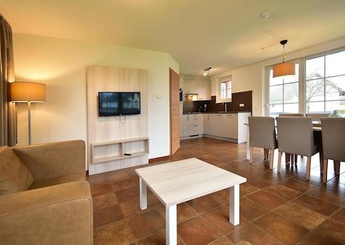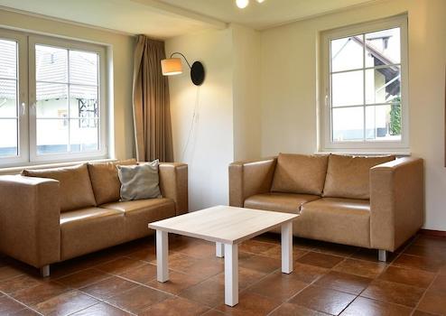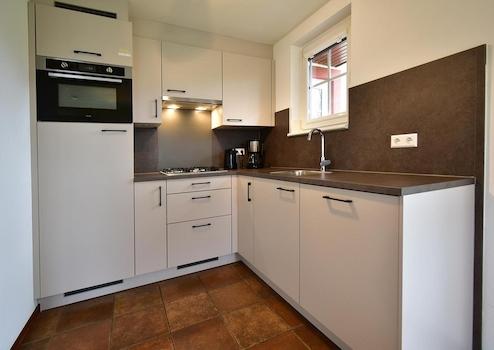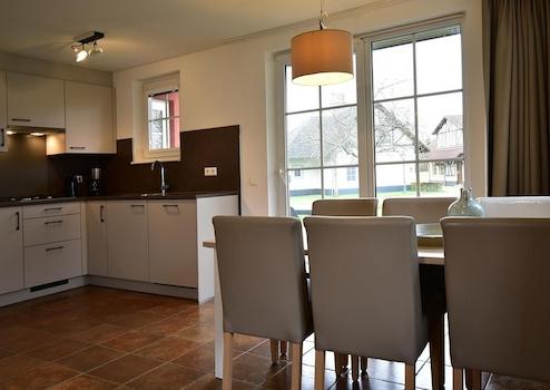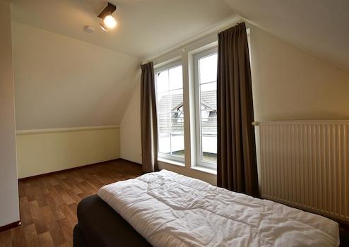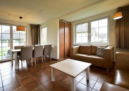 Das Haus präsentiert sich im typischen deutschen Landhausstil mit dunklem Ziegeldach, Fachwerkakzenten und Fensterläden. Der Eckstandort bietet zusätzliche Privatsphäre und viel Tageslicht im Wohnbereich. Über die Terrassentür gelangen Sie direkt auf die Terrasse und die Rasenfläche rund um das Haus. Im Inneren verfügt das Haus über ein helles Wohnzimmer mit Sitzecke, Essbereich und einer modernen, kürzlich erneuerten Küche in L-Form. Es gibt insgesamt drei Schlafzimmer: ein Schlafzimmer im Erdgeschoss und zwei Schlafzimmer im Obergeschoss, jeweils mit einem Einzel-Boxspringbett. Dank der zwei separaten Badezimmer – eines mit Dusche und eines mit Badewanne und Doppelwaschbecken – eignet sich das Haus hervorragend für die Nutzung mit mehreren Personen. Zusätzlich stehen zwei separate WCs zur Verfügung, eines im Flur unten und eines auf dem Treppenpodest oben. Diese Immobilie wird inklusive der stimmungsvollen Innenausstattung und inklusive einem Tripel Net Mietvertrags mit Roompot mit einem Ertrag von 10. 750 € exkl. MwSt. pro Jahr bei 0 Wochen Eigennutzung oder 10.500 € exkl. MwSt. pro Jahr bei 1 Woche Hochsaison und 2 Wochen Nebensaison Eigennutzung oder 9.500 € exkl. MwSt. pro Jahr bei 3 Wochen Hochsaison und 2 Wochen Nebensaison Eigennutzung. Diese Verträge laufen bis zur ersten Woche 2029.
